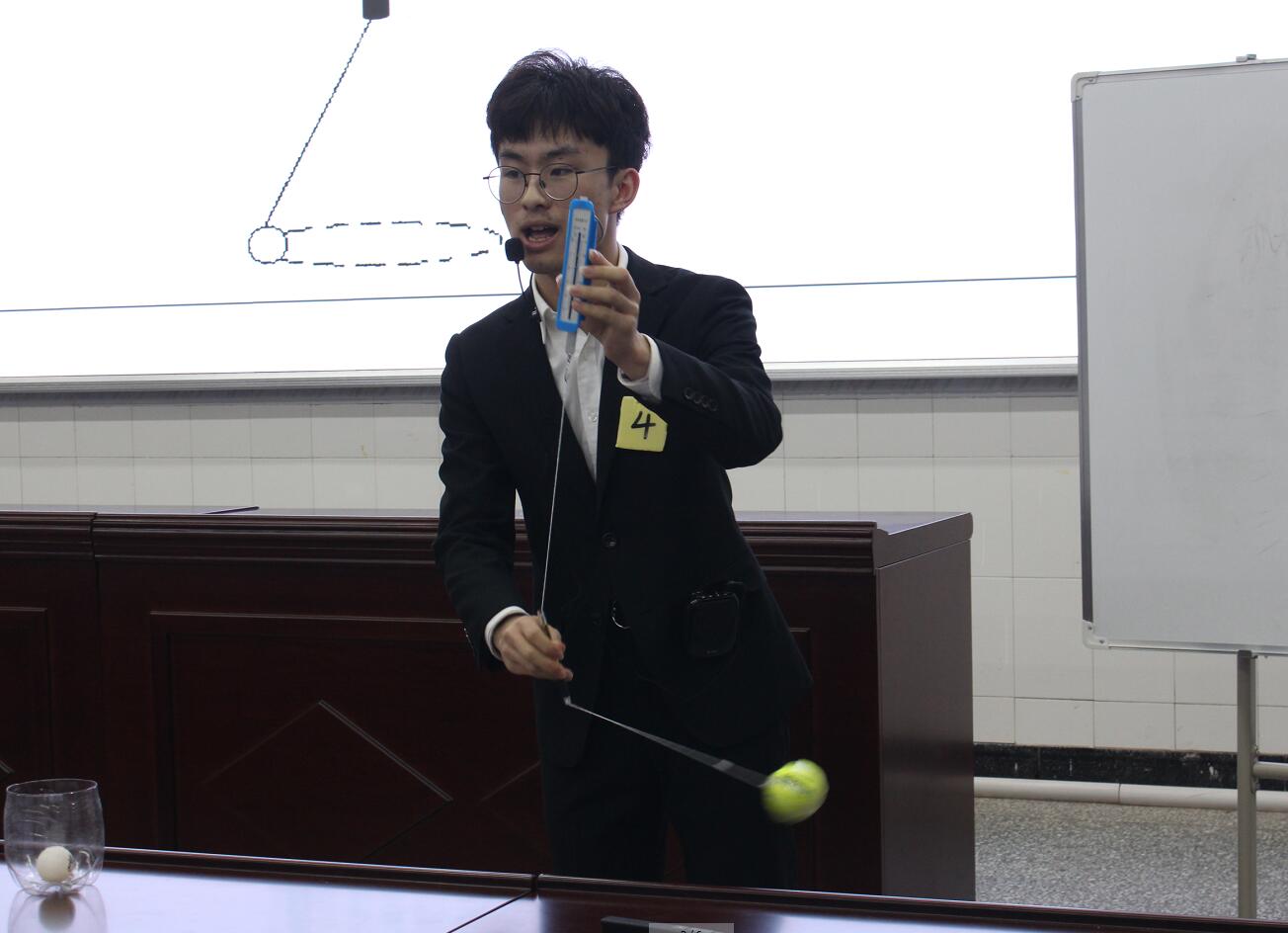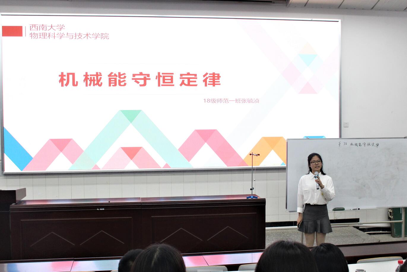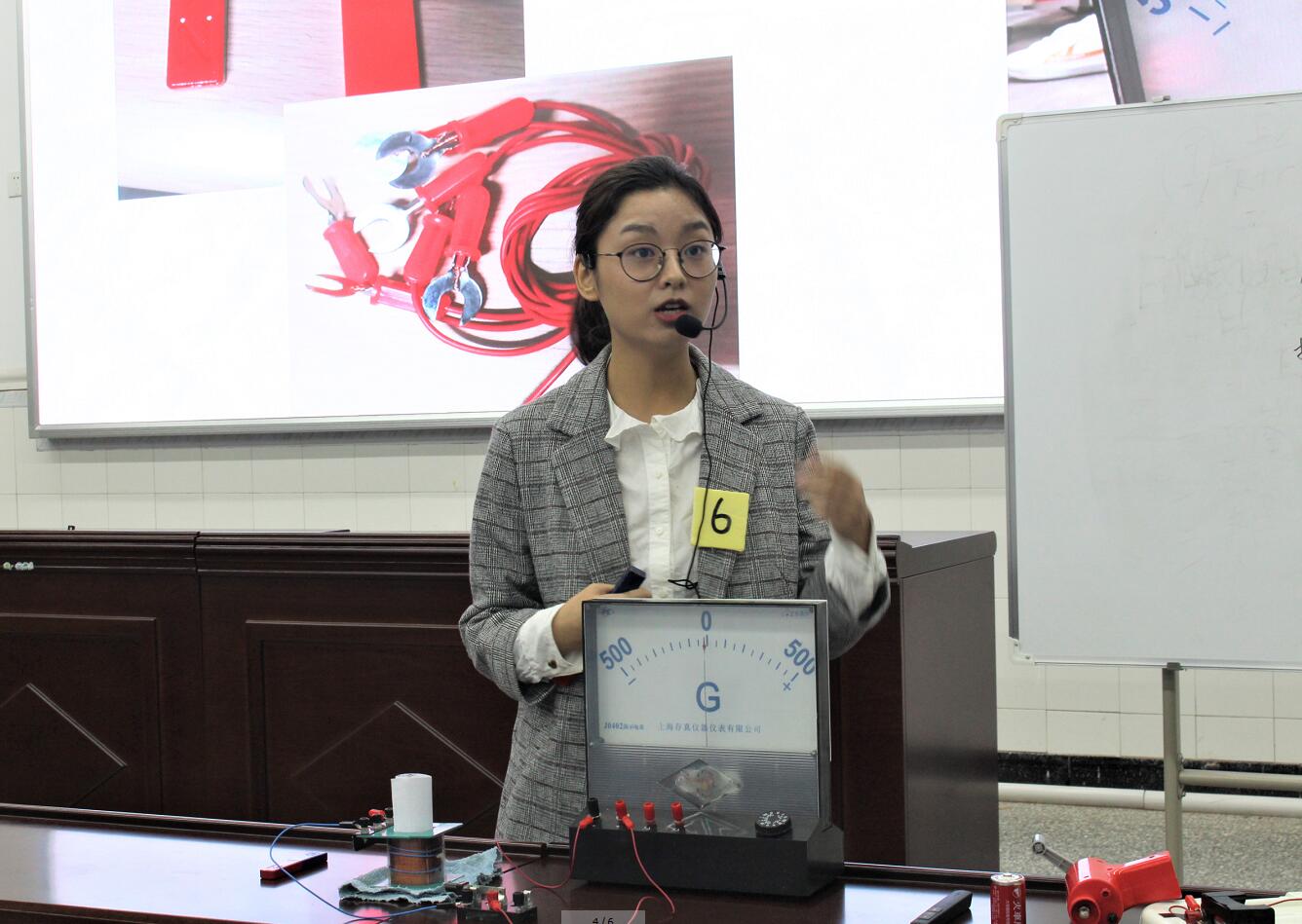 决赛分为课堂模拟教学和“三笔字”书写两个部分。在课堂模拟教学环节,选手依次上台进行2分钟的说课和10分钟的讲课。率先上场的选手是2018级师范1班的张毓浈同学,她设立“三人扔球比赛”的具体情景引入课题,通过形象的单摆实验条理清晰地讲解了机械能守恒定律;讲授同一课题、第二个登场的2018级师范3班杨文倩同学教态亲切自然,以瀑布的实例引导观众思考“能量是如何转换的”这一问题,进而讲解了“机械能是由动能和势能组成的”。2017级师范1班程育彦同学课堂构思巧妙,以“150斤的小明为什么不能坐旋转秋千”这一问题引出向心力的概念,将课程内容和生活实际有机联系;讲授同一课题的2017级师范2班刘明朗同学通过演示多个与向心力相关的小魔术和小实验,强调“物理是基于实验和观察的学科”。2017级师范4班马璐瑶同学采用控制变量法,改变时间等多个变量演示法拉第电磁感应定律实验,推导出法拉第电感应定律的影响因素。最后上场的2017级师范3班罗秋悦同学,教态亲切自然,语调抑扬顿挫,在授课过程中善于引导同学们进行思考,辅助手摇发电机等对比实验引出课题,清晰透彻地讲解了法拉第电磁感应定律。