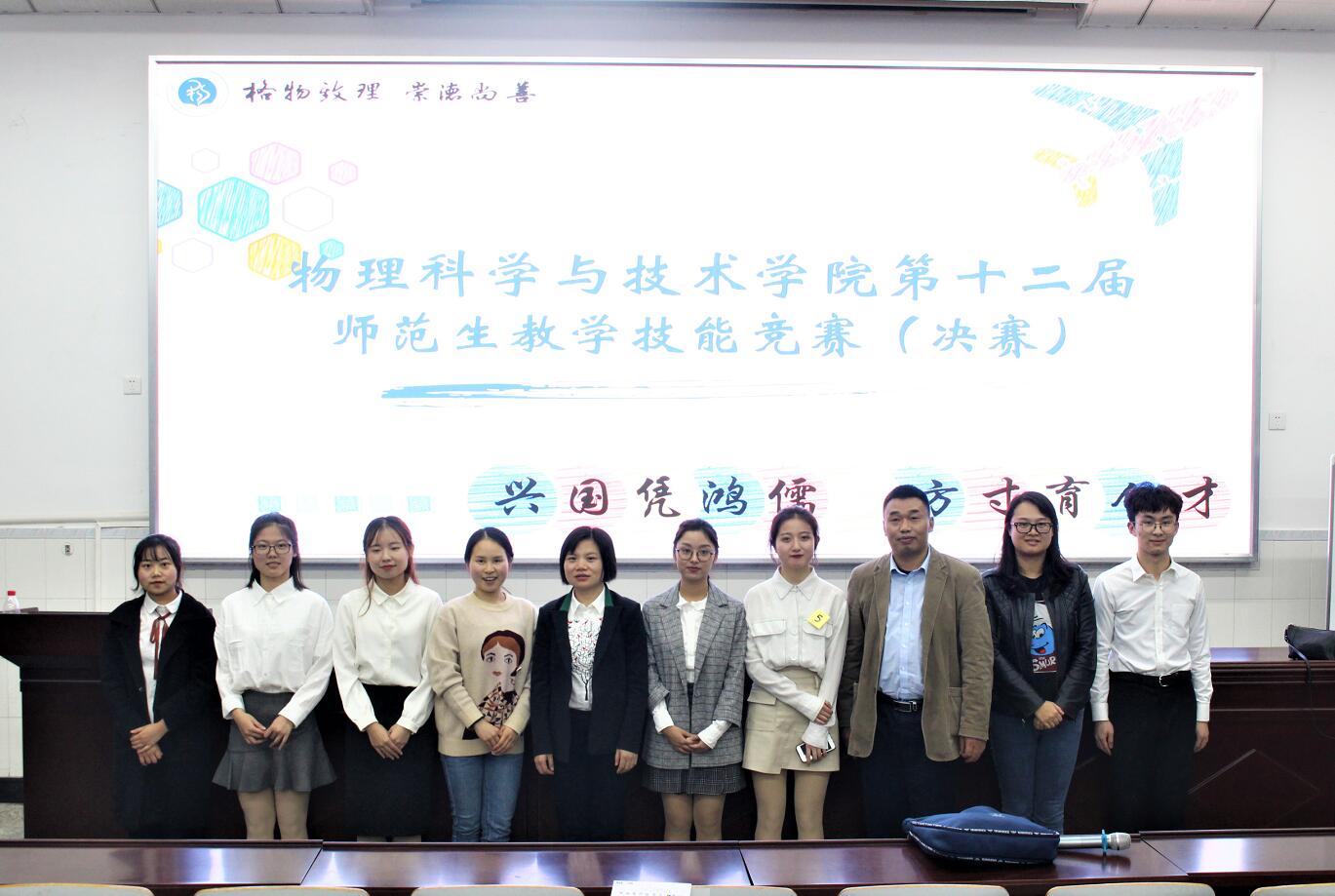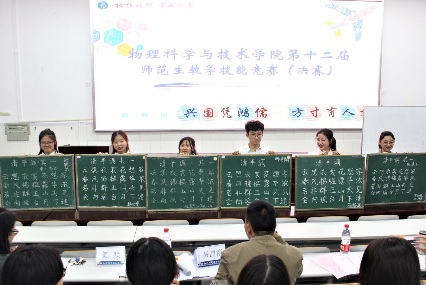 11月3日晚,“兴国凭鸿儒 方寸育人才”第十二届师范生课堂教学技能竞赛在物理大楼大阶梯教室举行。海棠书屋 高级实验师谭兴文副教授、海棠书屋 硕士生导师秦丽溶副教授和北碚区朝阳中学高中物理组陈文鑫老师担任评委,海棠书屋 团委书记贺颖老师出席活动。海棠书屋 2017级、2018级和2019级近200名本科生观摩比赛。