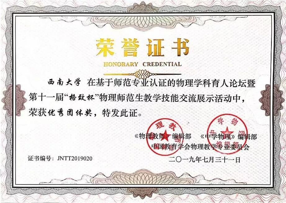 获得优秀团体奖。本次展示活动强化了师范生专业基础,充分体现了我校师范生教育教学质量和综合素质,也充分展现了物理学专业(公费师范)近年来积极推进品牌专业建设和师范教育改革,着力培养卓越中学物理教师所取得的显著成效。